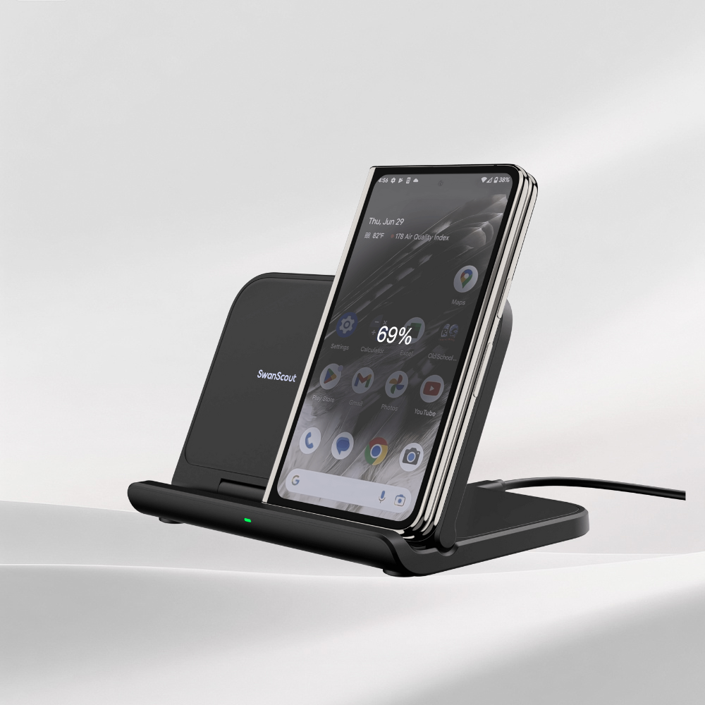 A causa di una posizione della bobina leggermente diversa sul Pixel 9 Pro Fold rispetto ad altri modelli Pixel, consigliamo SwanScout 708G2. Per garantire un allineamento ottimale e una ricarica stabile, il 708G2 include un cuscinetto di posizionamento in plastica rimovibile. Utilizzare il cuscinetto durante la ricarica del Pixel 9 Pro Fold per sollevare il telefono e allineare la bobina con precisione. Per altri modelli Pixel, il cuscinetto non è necessario. Questo design accurato garantisce la compatibilità tra modelli, una ricarica efficiente e un posizionamento sicuro del dispositivo.