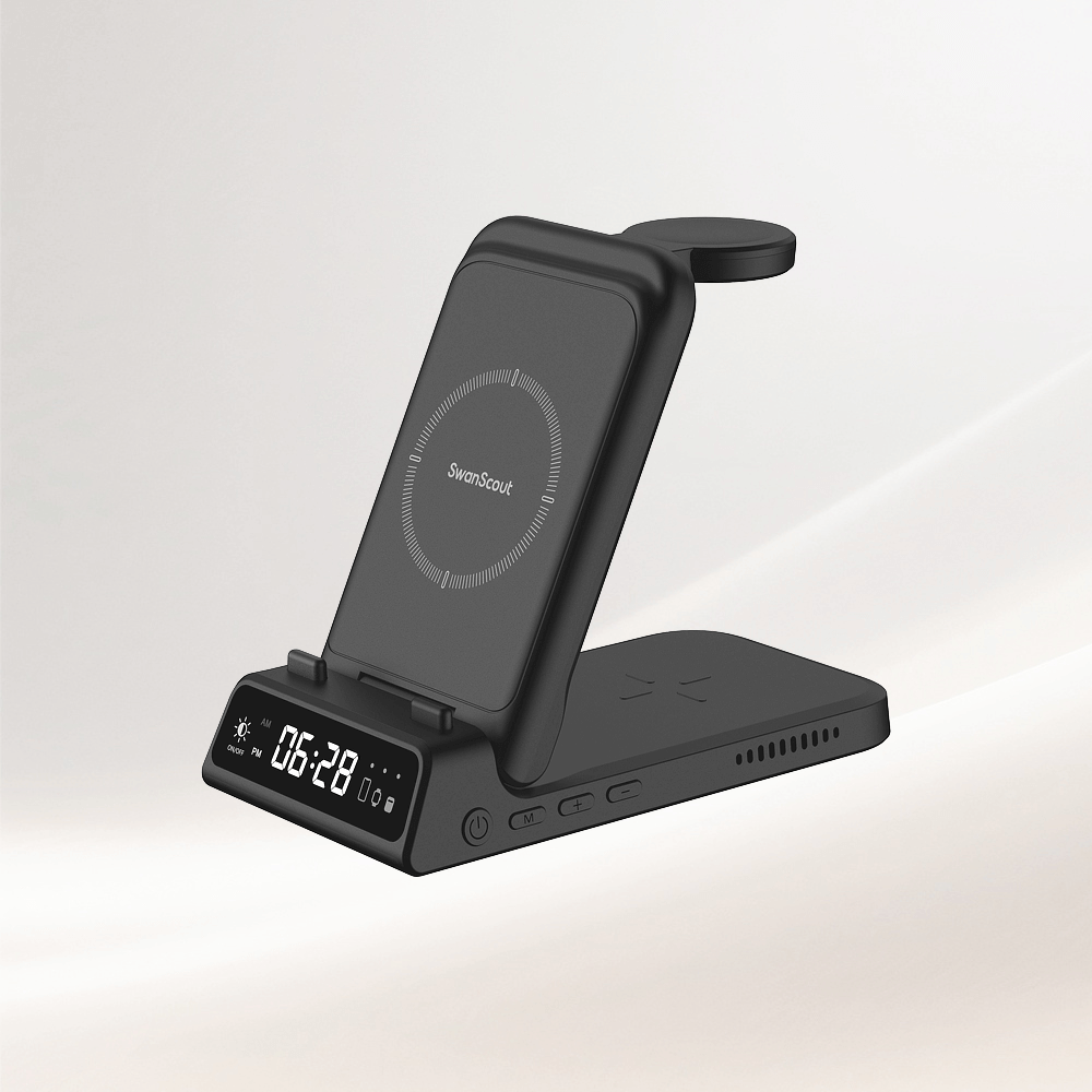 SwanScout充電器は、あらゆるブランドのQi対応スマートフォンとイヤホンに対応し、インテリジェントな電力分配機能により各デバイスの出力を調整します。スマートウォッチ向けには、各ブランドに合わせてカスタマイズされた専用充電モジュールが、正確な位置合わせと安全な動作を保証します。PDアダプターを使用すると、SwanScout充電器は最大15Wの最適化された出力を提供し、高速パフォーマンスとバッテリー保護のバランスを保ちます。