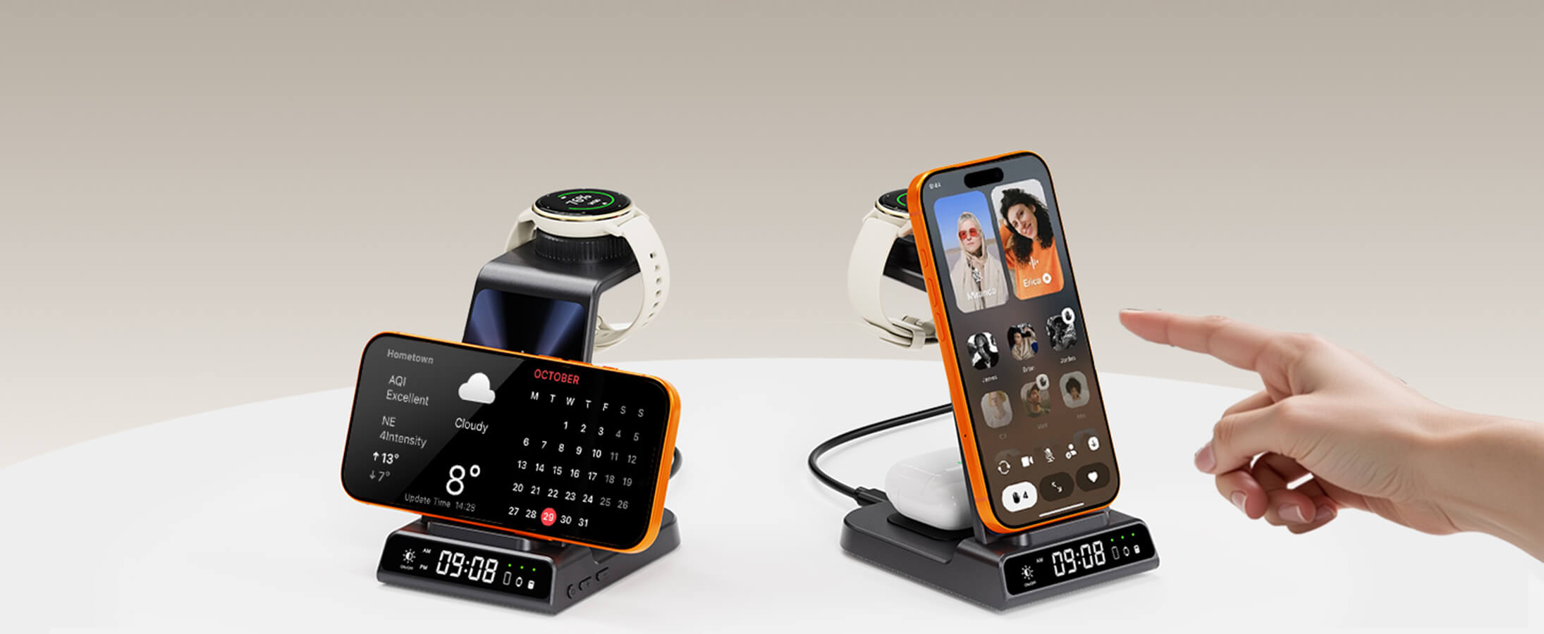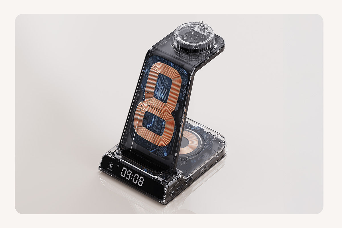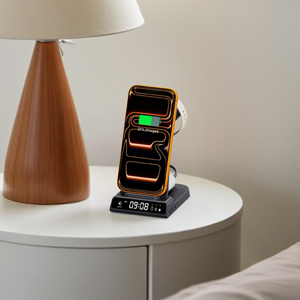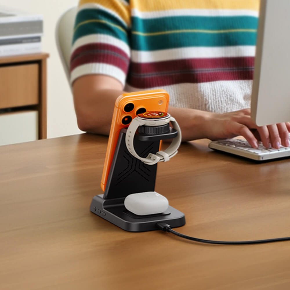 Uma solução completa para carregar três dispositivos, mantendo seu espaço de trabalho limpo e eficiente.
