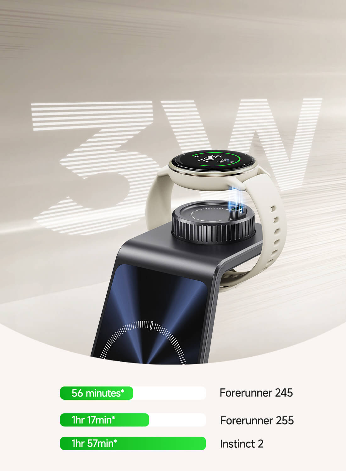 • Carregador sem fio 3 em 1: Carrega simultaneamente um relógio Garmin, um telefone com carregamento sem fio e um par de fones de ouvido sem fio com estojo de carregamento, economizando espaço.