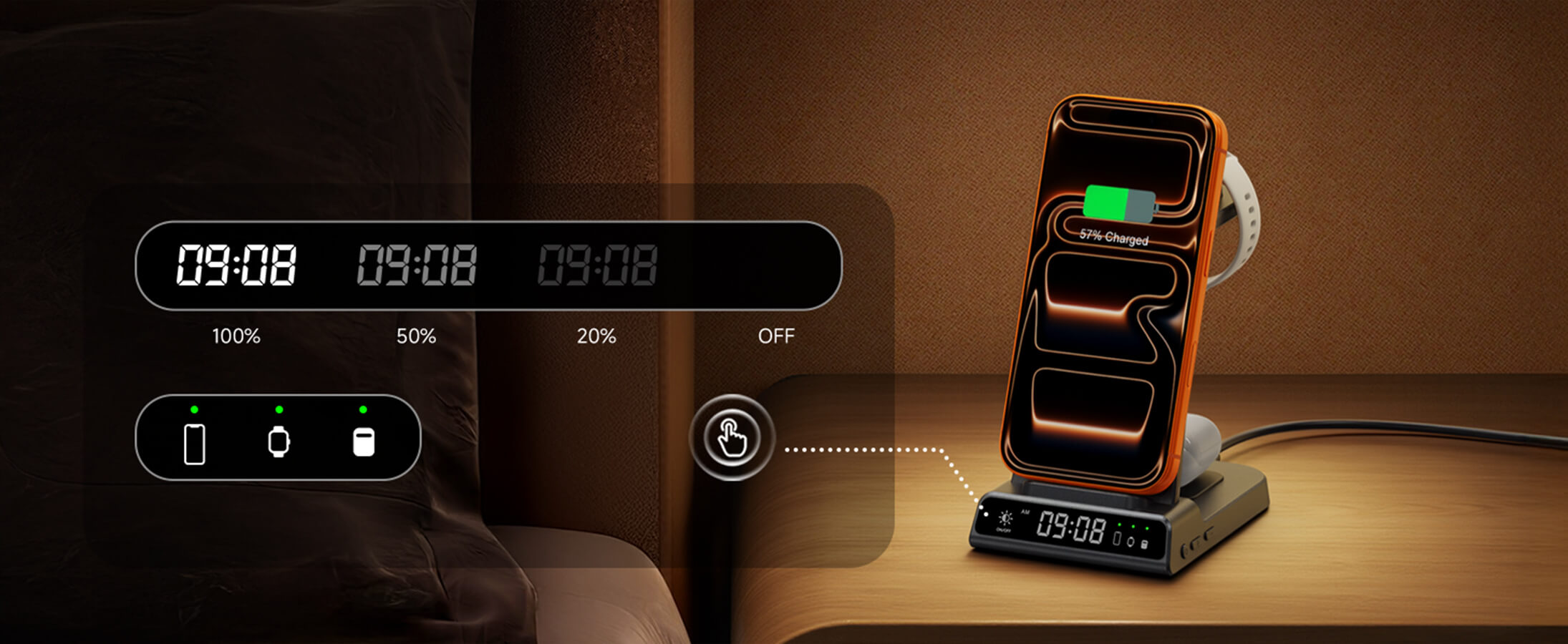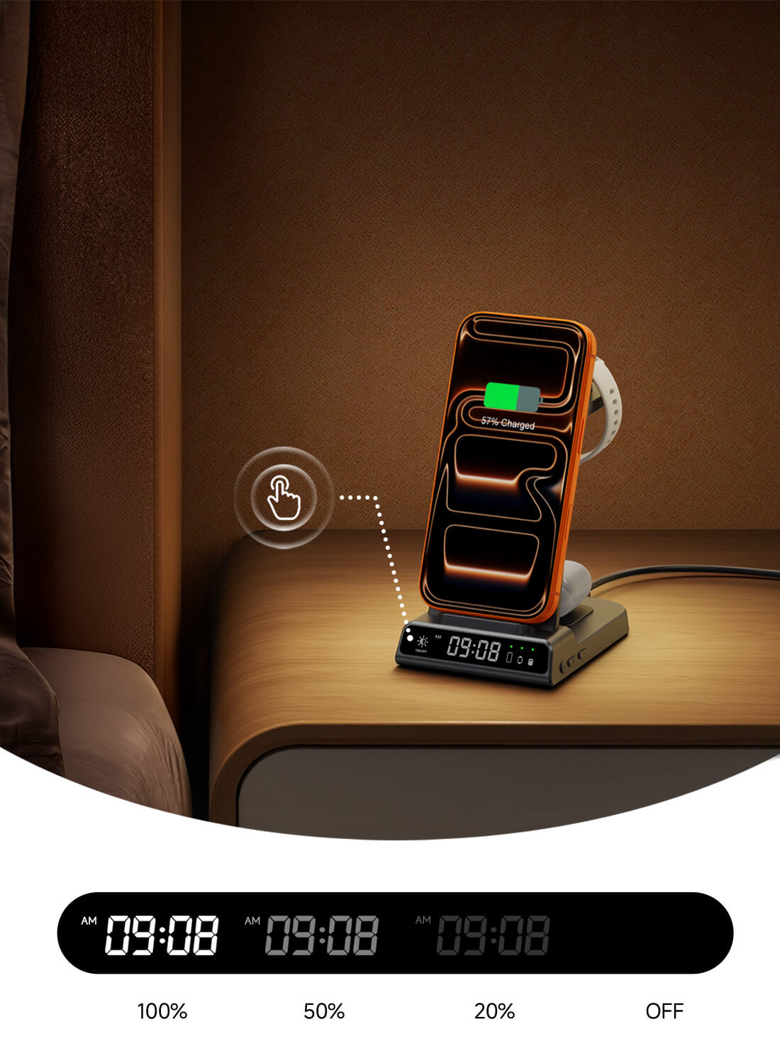 Relógio com brilho ajustável, perfeito para visualização noturna, garantindo que seus dispositivos estejam totalmente carregados todas as noites.