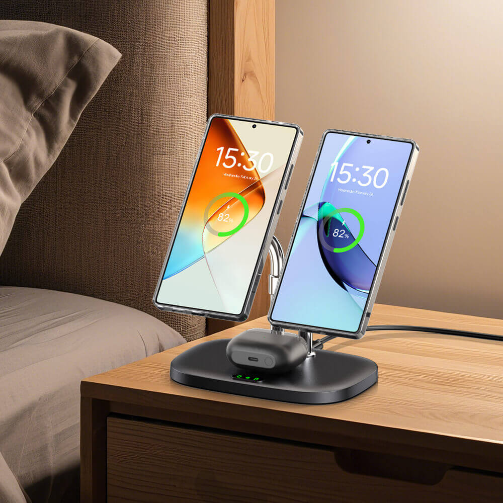 • Dubbel magnetisk laddning: Laddar två telefoner samtidigt med starka magneter, perfekt för par, användare med flera enheter eller alla som hanterar personliga och arbetsrelaterade telefoner.
