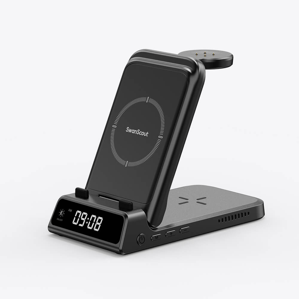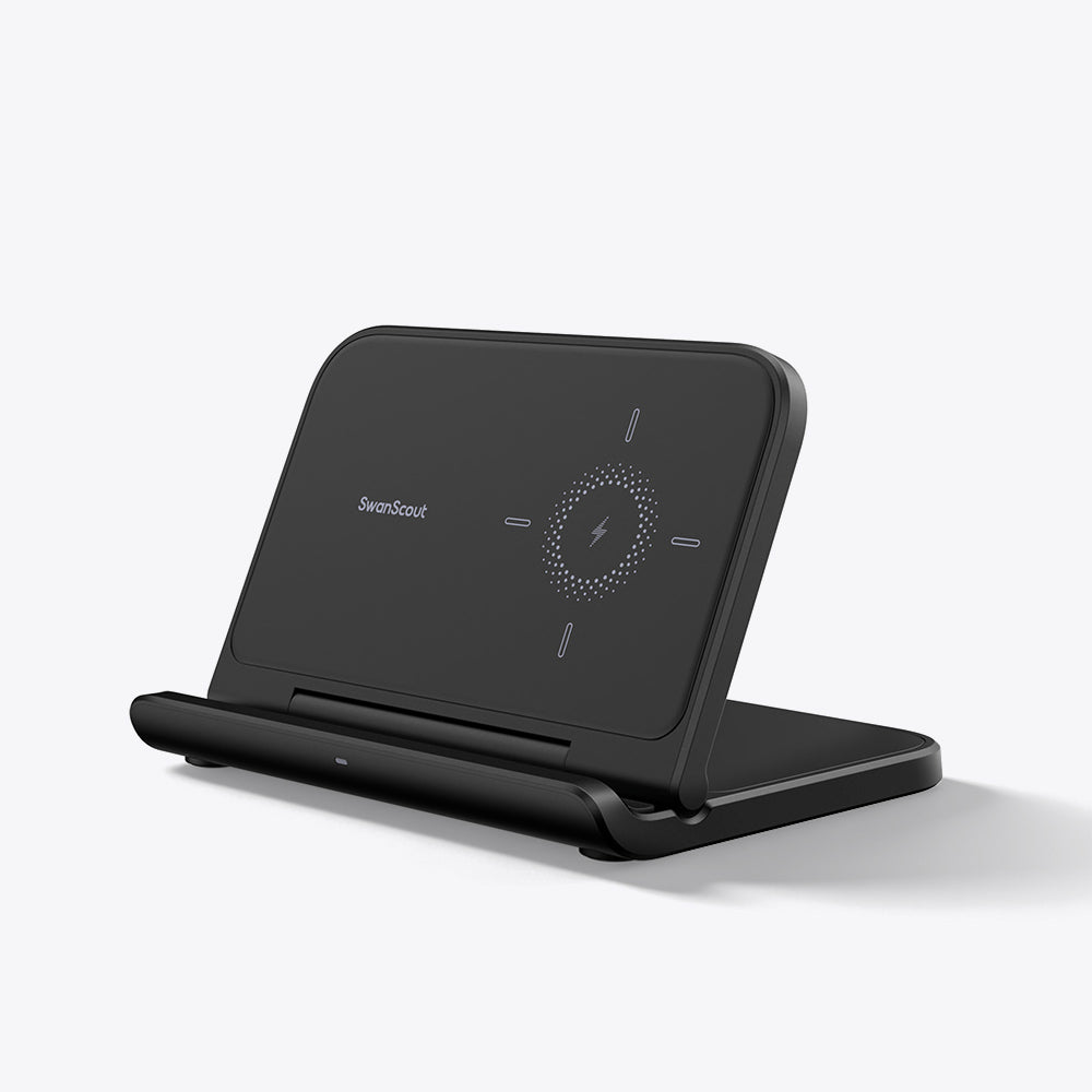 SwanScout 的可折叠无线充电器通常支持两种充电模式:将充电器竖直放置,使手机保持垂直,非常适合边充电边观看内容或查看信息。如果充电不成功,请尝试调整折叠角度,使其与手机线圈更好地对齐。平放时,充电器可以为手机或无线耳机充电。对于耳机,请将其与充电板上标记的线圈图标对齐,以确保准确定位。这种灵活的设计支持各种设备布局,并提高了便利性和兼容性。