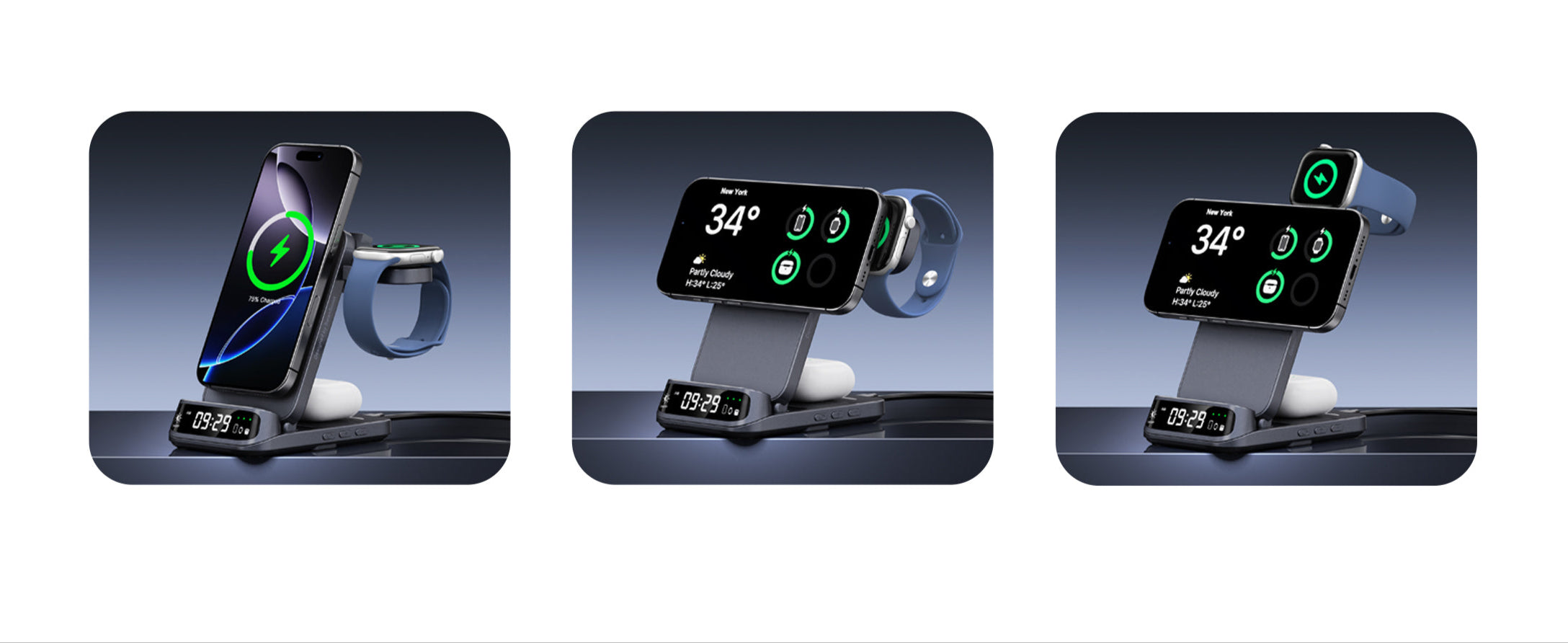 优雅的无线充电支架,兼容 MagSafe,适用于 iPhone 17/16/15/14/13/12 系列的可折叠无线充电站,Apple Watch 10/Ultra2/9/8/7/6/5/SE 专用的 iWatch 充电器,适用于 AirPods 2/3/4(支持主动降噪)/AirPods Pro 1/2 的无线充电器。- 旅行便携式充电支架(不含适配器)。