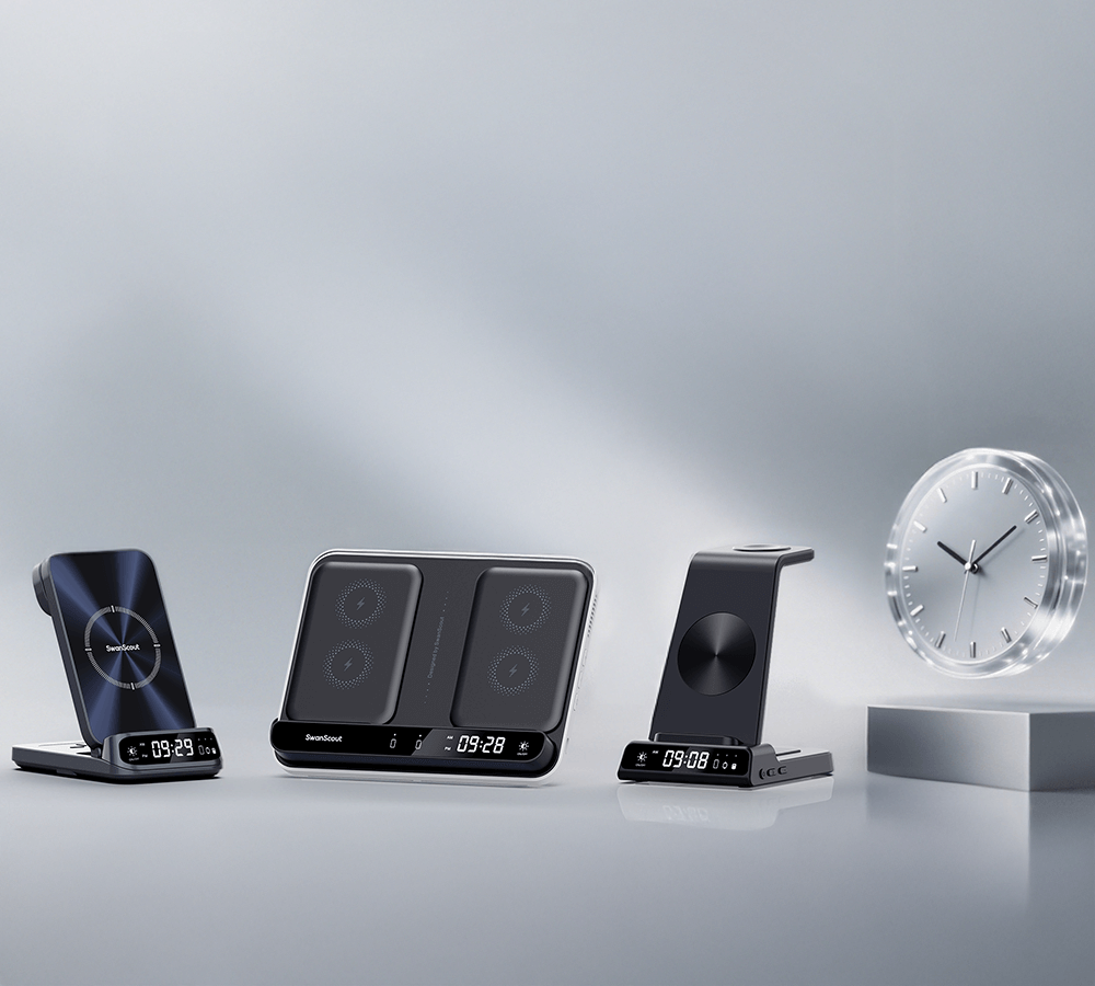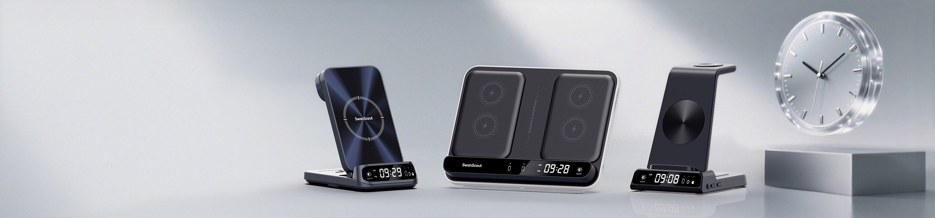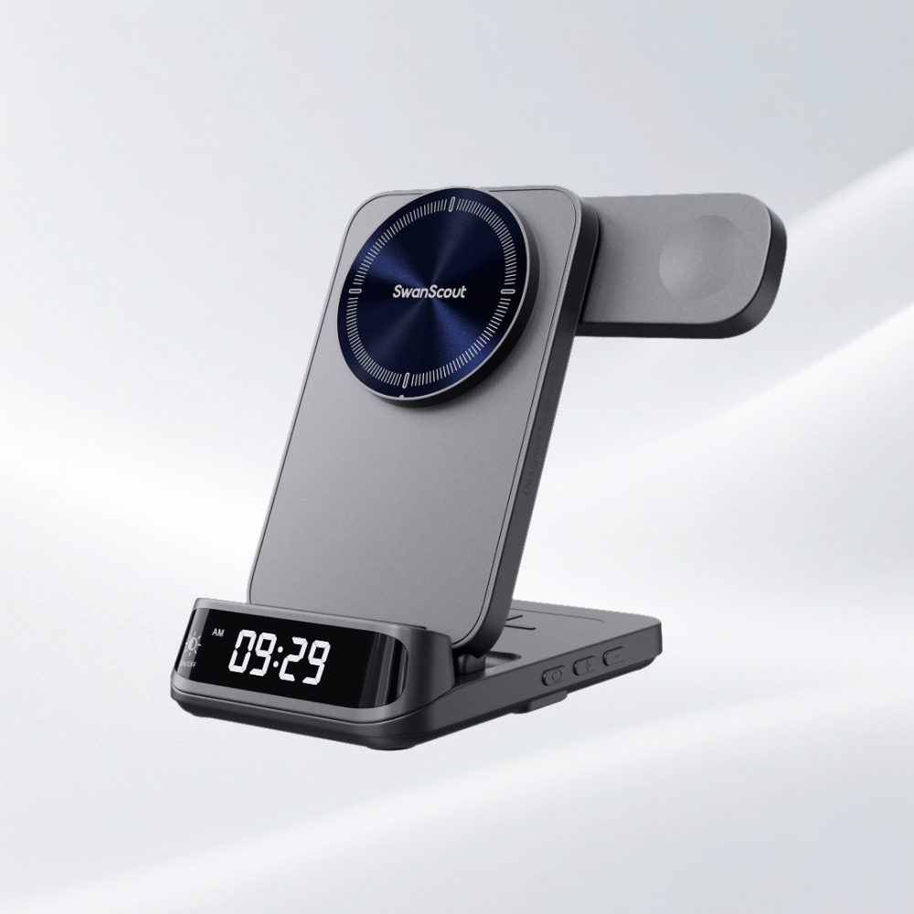 SwanScout 的時鐘無線充電器集快速磁力充電和清晰的數位時鐘於一體,設計優雅。無論您在書桌、床邊或學習區,都能為手機充電,讓您按時完成日程安排,同時保持整潔有序的空間。